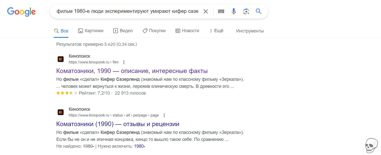 И он делает! Отображается запись в Кинопоиске о фильме 1990-х годов «Коматозники», культовой классике о студентах-медиках, экспериментирующих с околосмертными опытами. На странице Кинопоиска слово «эксперимент» даже не встречается, а Кифер Сазерленд снялся в более чем 29 фильмах 1990-х годов, в которых умерло множество персонажей. Заметили, как я случайно набрал 1980-е годы, а Google все равно все понял? Отличная работа Google.