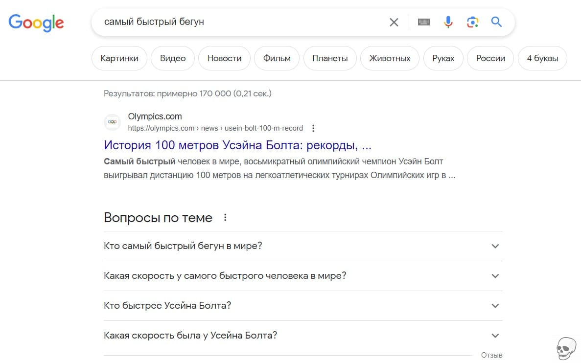 В приведенном выше примере, просто выполнив поиск “самый быстрый бегун” в первом в результатах поиска Усэйн Болт указан в верхней части результатов поиска. Это несколько надежных предположений от Google! Мы можем видеть сильные возможности Google в определении фактического значения, стоящего за нашим поиском, хотя я только намекнул на человека, о котором я ищу. Это технология Google RankBrain в действии, формируя связи за кулисами. По мере того, как популярные тенденции приходят и уходят, эта технология сопоставления автоматически применяется в новых поисковых запросах и органично меняется в соответствии со временем.